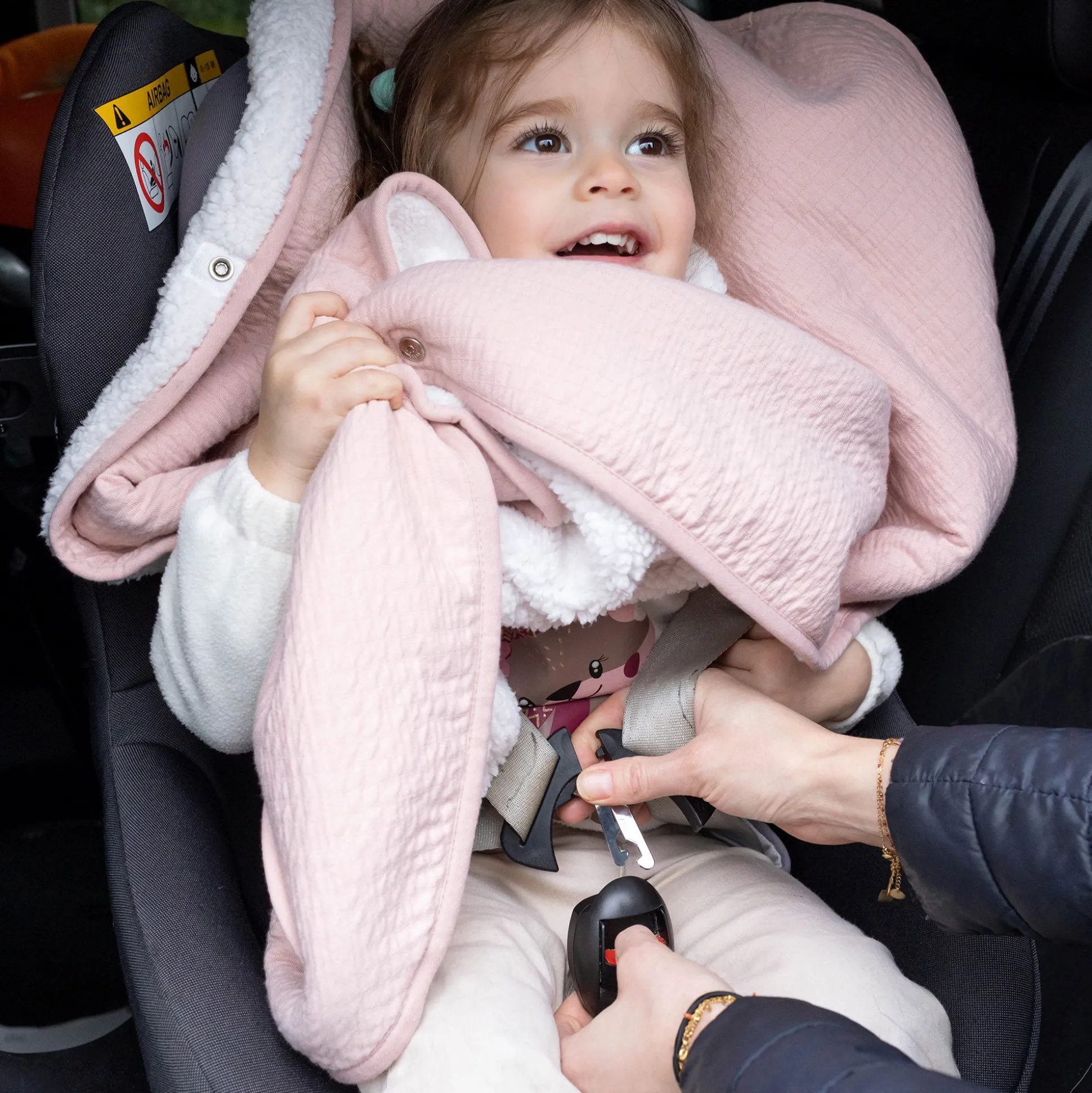 Zelfs Wanneer De Baby Een Poncho Draagt, Kunt U De Veiligheidsgordels Goed Om Zijn Lichaam Doen Aansluiten Zodat Hij Helemaal Veilig Zit.
